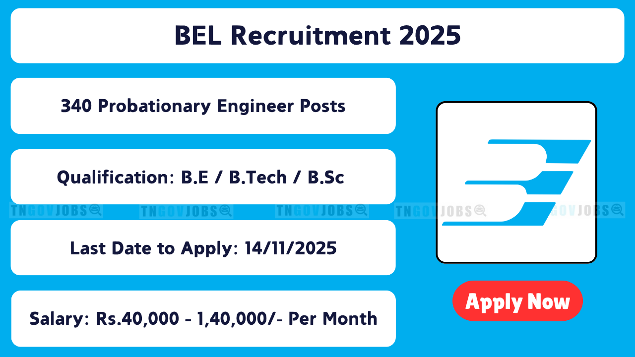 BEL Recruitment 2025: Bharat Electronics Limited (BEL) has released the recruitment notification No: 17556/HR/All-India/2025/2 to fill the 340 Probationary Engineer (PE) Posts. This online facility will be available on the Official website @ https://bel-india.in/ from 24-10-2025 at 11:00 AM to 14-11-2025 at 11:59 PM. Before submitting an application, candidates must carefully read the BEL Probationary Engineer (PE) 2025 notification and verify their eligibility. Check the BEL Notification 2025 for salary and additional benefits like medical insurance, PF, TA/DA, etc. Applicants must have a working Email Address and Mobile Number that they maintain until the BEL Recruitment 2025 results are announced.