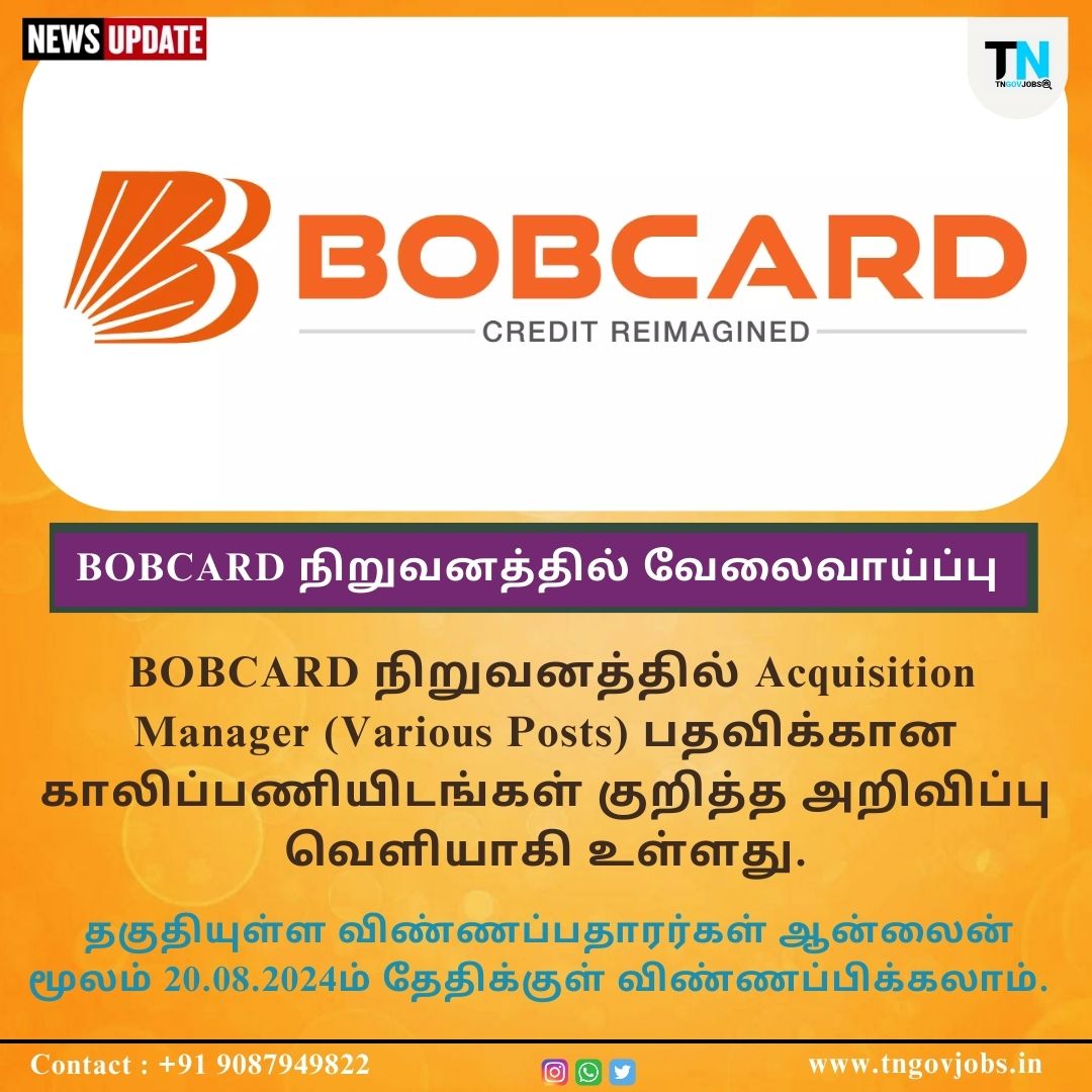 BOBCARD Recruitment 2024 : BOBCARD Limited invites Online Application for Recruitment to the Post of Acquisition Manager in Ahmedabad, Jaipur, Delhi, Mumbai, Hyderabad, Bengaluru, Chennai. Eligible candidates can Apply Online on or Before 20.08.2024.