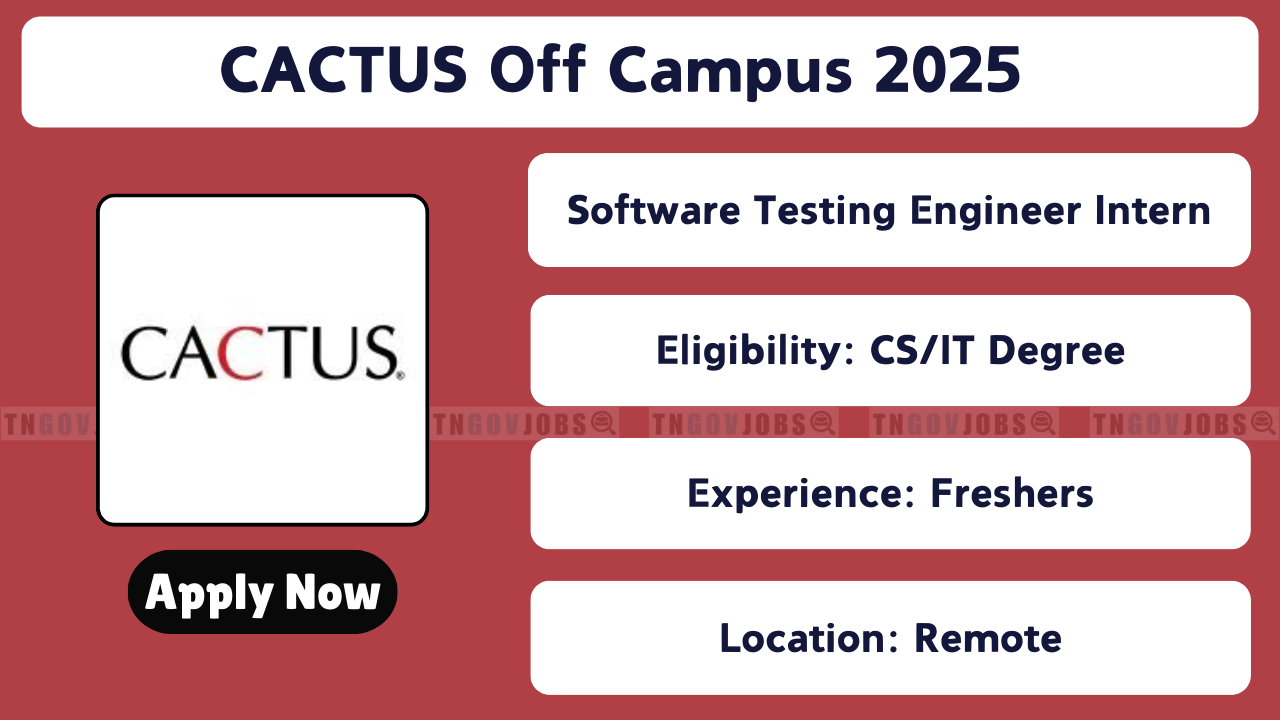 CACTUS Recruitment 2025 – Software Testing Engineer Intern: Cactus Communications is hiring Software Testing Engineer Interns (QA) across India. Remote-first role with stipend. Freshers with BE/B.Tech/BSc IT/CS/MCA are eligible. Apply now!