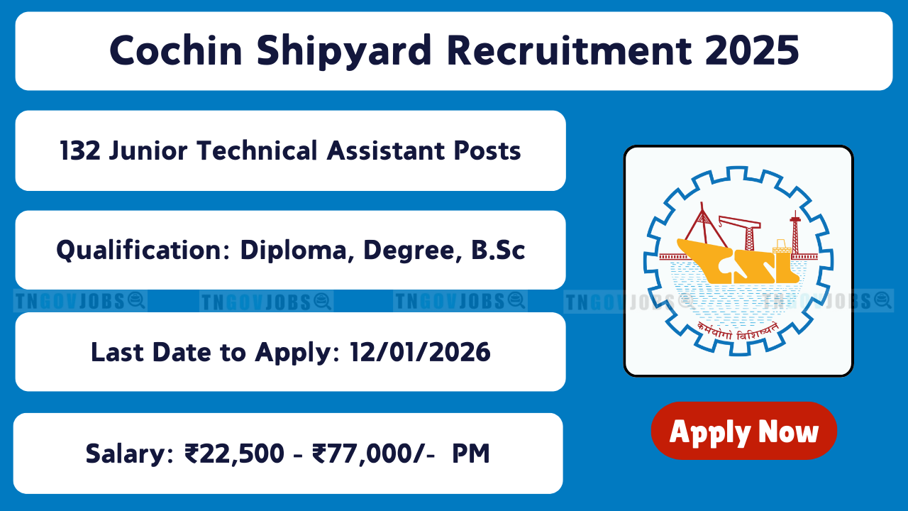 Cochin Shipyard Recruitment 2025: Cochin Shipyard Limited has released notification No: CSL/P&A/RECTT/PERMANENT/WORKMEN/2025/2 dated 24 December 2025 for 132 Senior Ship Draftsman, Junior Technical Assistant & Other Posts. Apply Online from 26-12-2025 to 12-01-2026. Fee ₹700 (exempted for SC/ST/PwBD)!