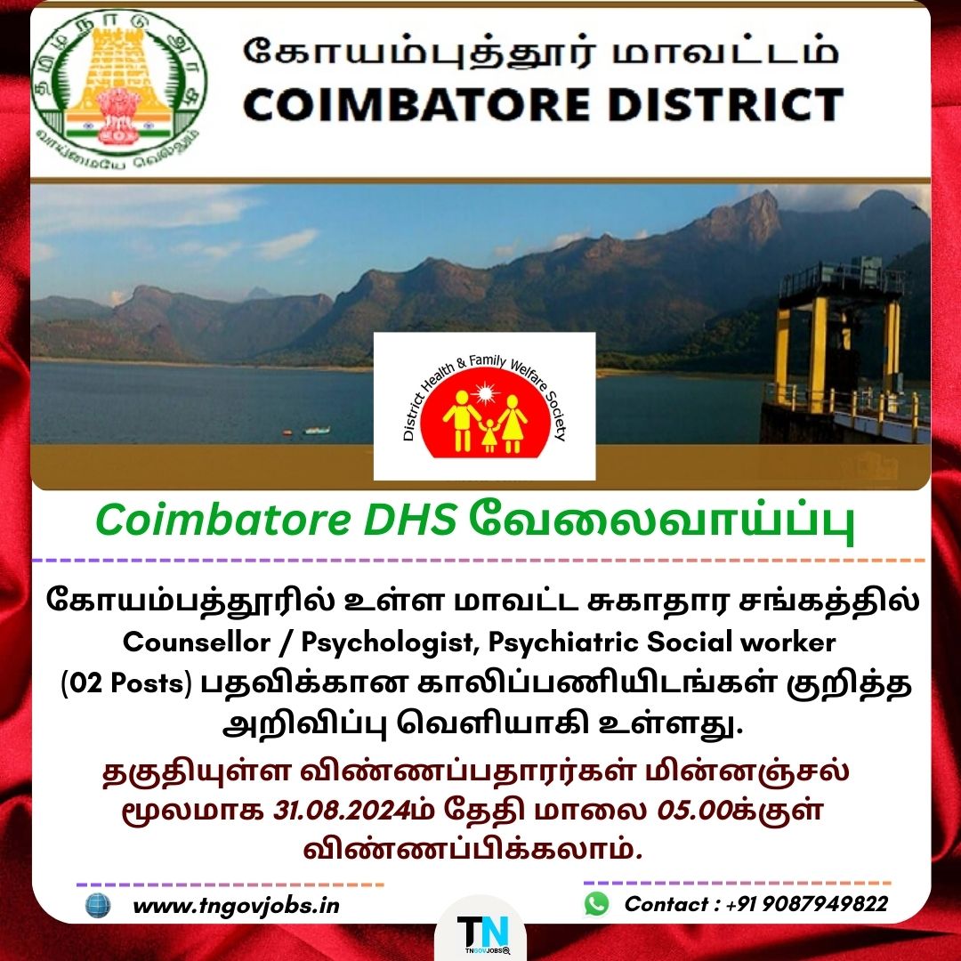 Coimbatore DHS Recruitment 2024 :Coimbatore District Health Society invites Offline applications for Recruitment of Counsellor / Psychologist, Psychiatric Social worker Posts in Coimabatore. Eligible candidates can Apply Offline on or Before 31.08.2024 @ 05.00 PM.