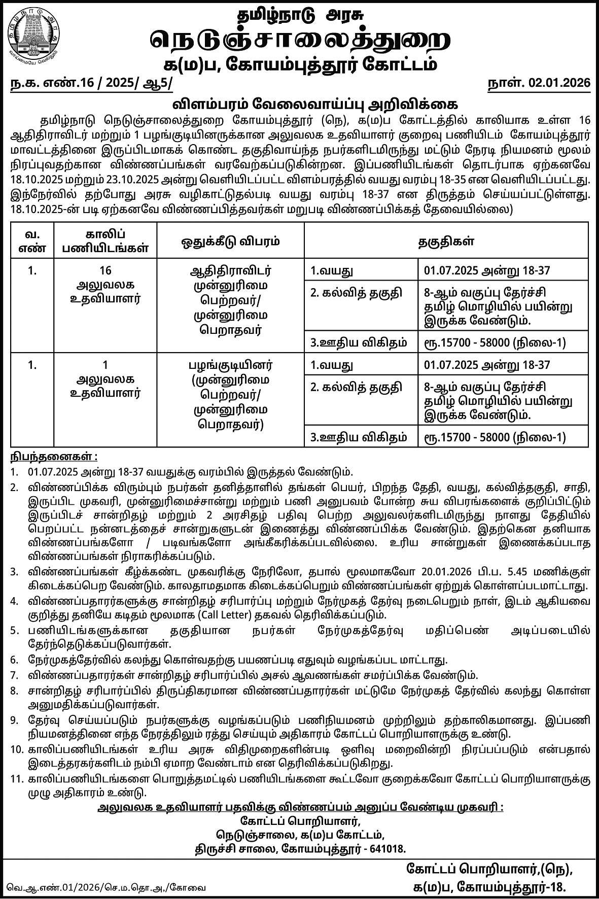 திருச்சி சாலை, கோயம்புத்தூர் – 641018Last Date: 20-01-2026