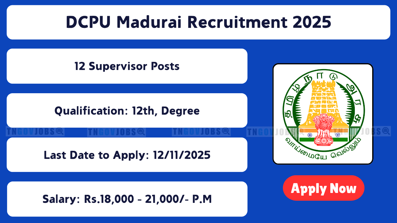 DCPU Madurai Recruitment 2025: District Child Protection Unit Madurai (DCPU Madurai) has released a notification at madurai.nic.in for recruitment to the posts of Case Worker, Supervisor in Madurai, Tamil Nadu. Interested candidates can apply offline on or before 12-11-2025 by sending the application to the specified address. Candidates must carefully review the DCPU Madurai notification details, including eligibility, selection process, salary details, and application procedure.