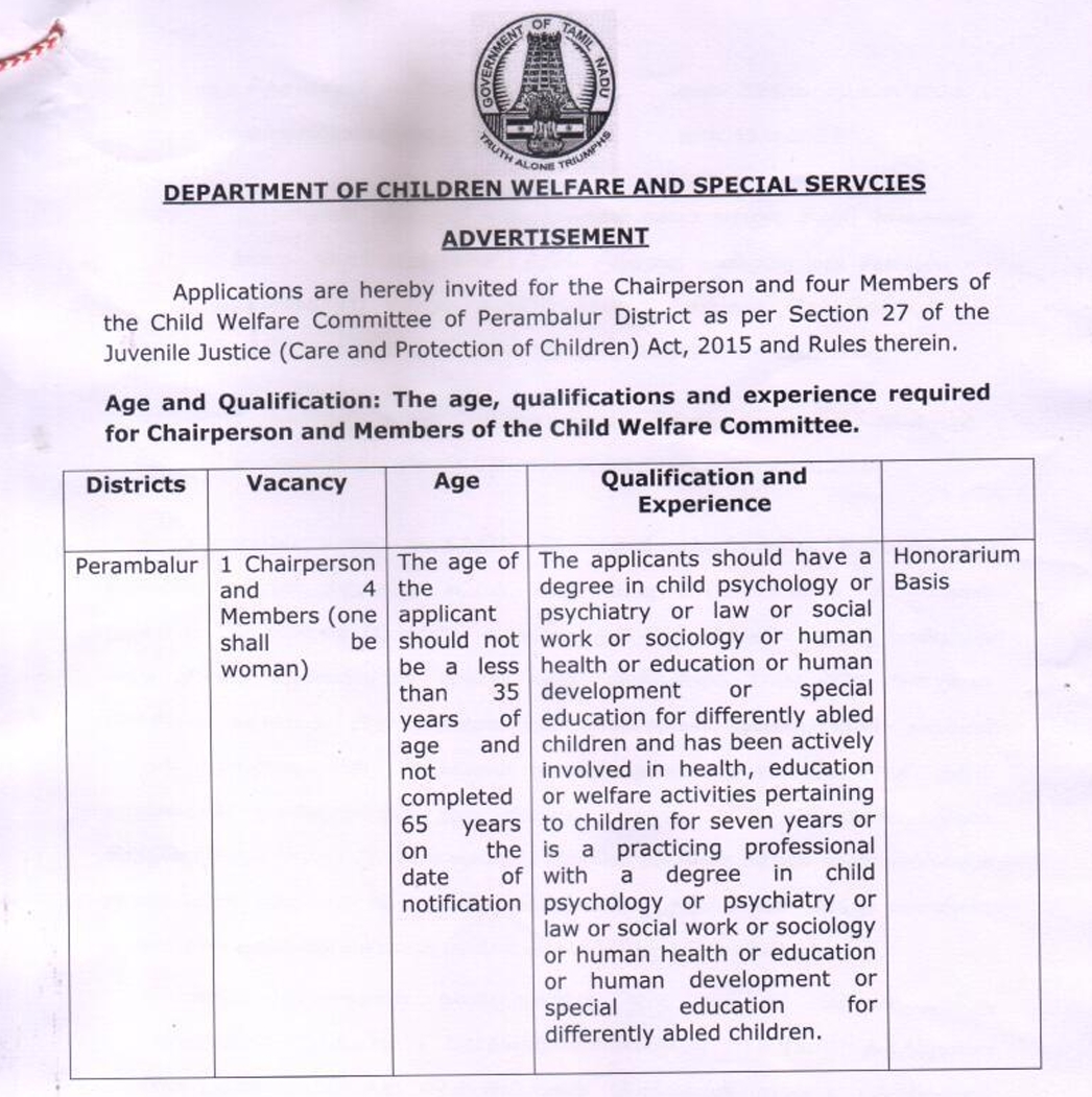DCWSS Perambalur Recruitment 2024: Applications are invited by the Director of Children Welfare and Special Services from the eligible candidates for appointment as Chairperson and Members in Child Welfare Committee, Perambalur Distrrict. Eligible candidates can Apply Offline on or before 06.12.2024.