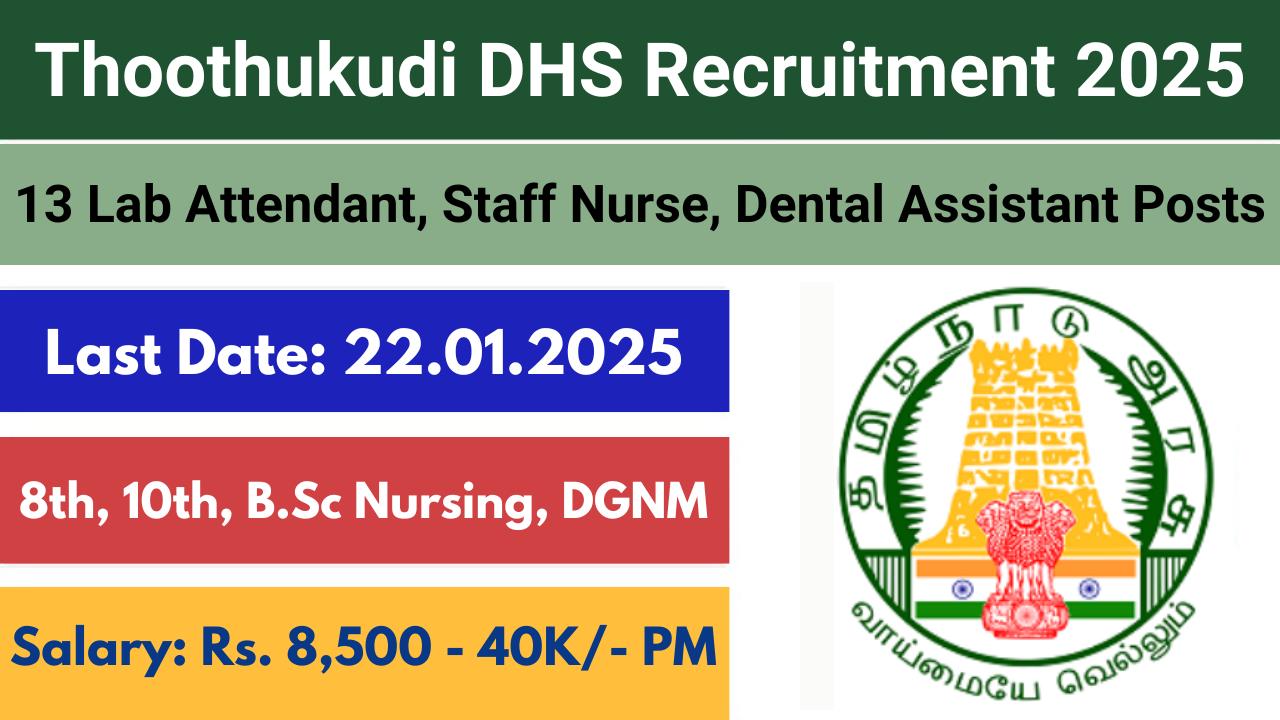 DHS Thoothukudi Recruitment 2025: Thoothukudi District Health Society (DHS) has announced a recruitment notification for 13 positions, including District Quality Consultant, Dental Assistant, Lab Attendant, Radiographer, Staff Nurse, Van Cleaner, Instructor for the Young Hearing Impaired, MPHW (DEIC), MPW (AYUSH), and MPHW (UH & WC). Interested candidates can download the application form in PDF format from the official website @ https://thoothukudi.nic.in/. The completed application form, along with all necessary enclosures, must be submitted by 22.01.2025.