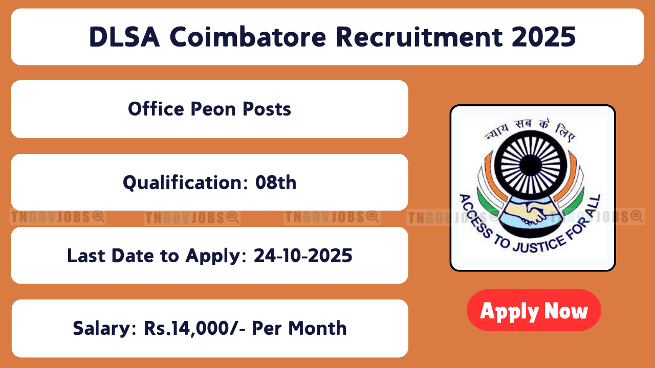 DLSA Coimbatore Office Peon Recruitment 2025: District Legal Services Authority Coimbatore (DLSA Coimbatore) has released a notification at coimbatore.dcourts.gov.in for recruitment to the post of Office Peon in Coimbatore, Tamil Nadu. Interested candidates can apply offline on or before 24-Oct-2025 by sending the application form along with relevant self-attested documents to the specified address. Candidates must carefully read the DLSA Coimbatore Office Peon 2025 notification and verify their eligibility before applying. Check the DLSA Coimbatore Notification 2025 for salary and additional benefits like medical insurance, PF, TA/DA, etc. Applicants must maintain a working Email Address and Mobile Number until the DLSA Coimbatore Recruitment 2025 results are announced.