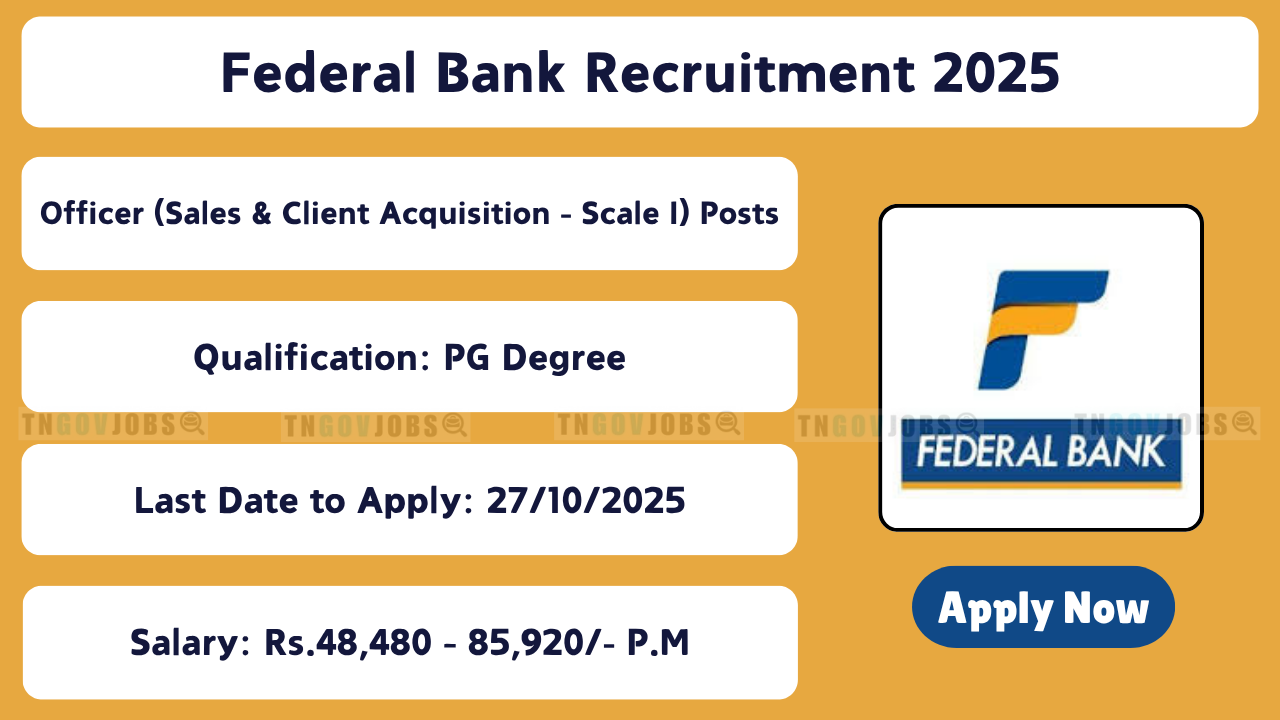 Federal Bank Recruitment 2025: Federal Bank has released a notification at federalbank.co.in for recruitment to the posts of Officer (Sales & Client Acquisition – Scale I) in All India. Interested candidates can apply online on or before 27-10-2025. Candidates must carefully review the Federal Bank notification details, including eligibility, selection process, salary details, and application procedure.
