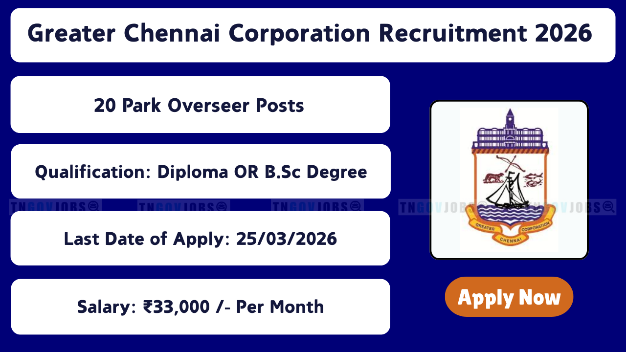 Greater Chennai Corporation Recruitment 2026 invites offline applications for 20 Park Overseer vacancies on contract basis (12 months). Last date for receipt of filled applications: 25 March 2026. Qualification: Diploma / B.Sc / Degree in Horticulture / Forestry / Agriculture / Botany (Plant Science). Desirable: Working knowledge of Computer & MS-Office. Salary: ₹33,000 per month (consolidated). Selection through Shortlisting + Interview. No application fee. Full eligibility & apply process below.