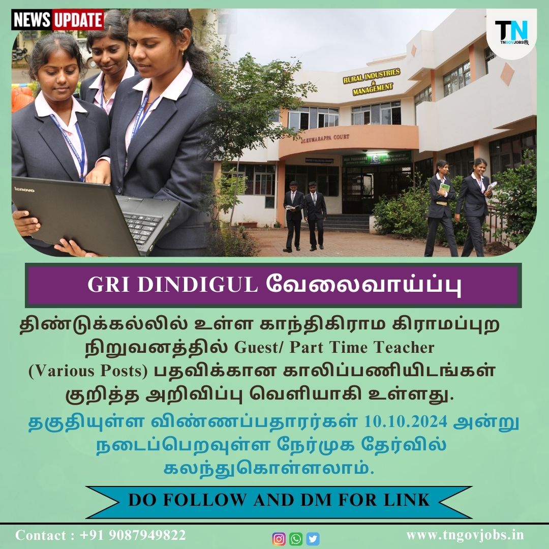 GRI Dindigul Recruitment 2024: Gandhigram Rural Institute (GRI Dindigul) invites Offline Application for recruitment to the Post of Guest/ Part Time Teacher in Dindigul. Eligible candidates can Attend Walk-in on 10.10.2024.