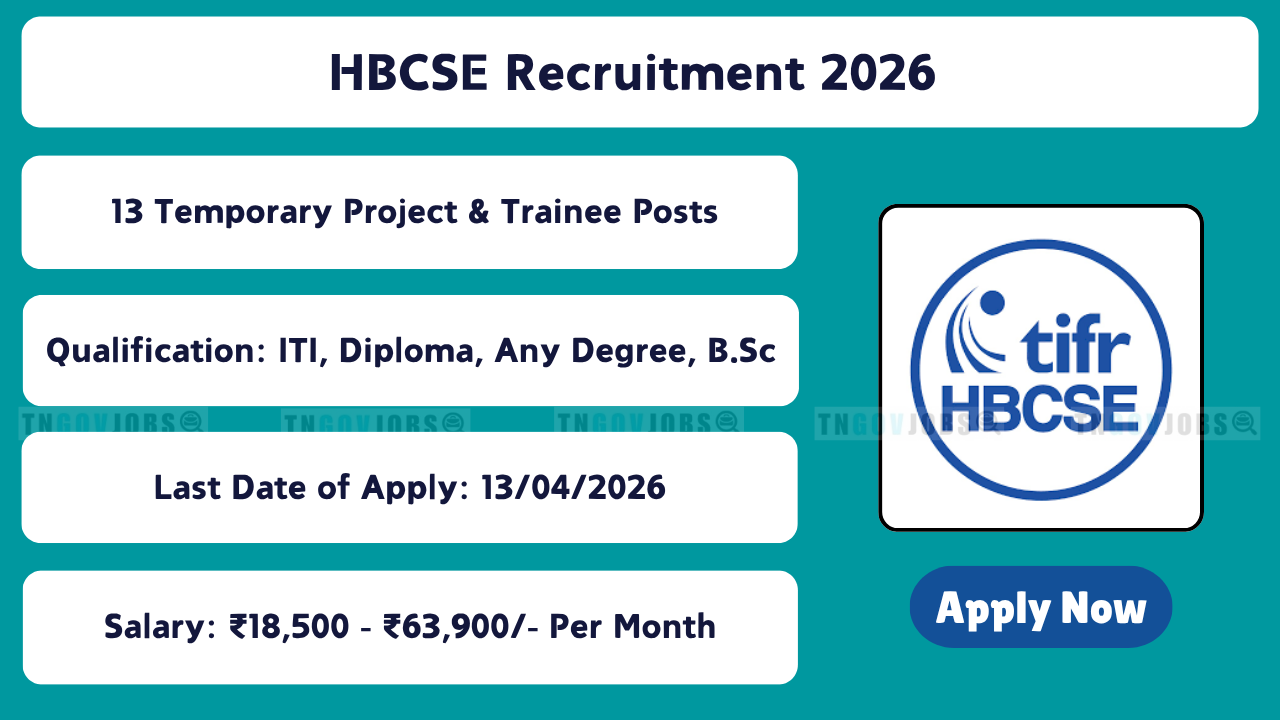 Homi Bhabha Centre for Science Education (HBCSE), Tata Institute of Fundamental Research (TIFR), Mumbai has released Advertisement No. 01/2026 for **13 temporary Project & Trainee posts**. Positions include Project Scientific Assistant-B, Project Assistant, Project Tradesman-B, Project Work Assistant, Clerk Trainee, Technical Trainee (Civil), Tradesman Trainee (Carpenter) and Tradesman Trainee (Plumber). Walk-in interviews will be held from **13 April 2026 to 28 April 2026** at HBCSE, Mankhurd, Mumbai. Bring filled application form and original documents.