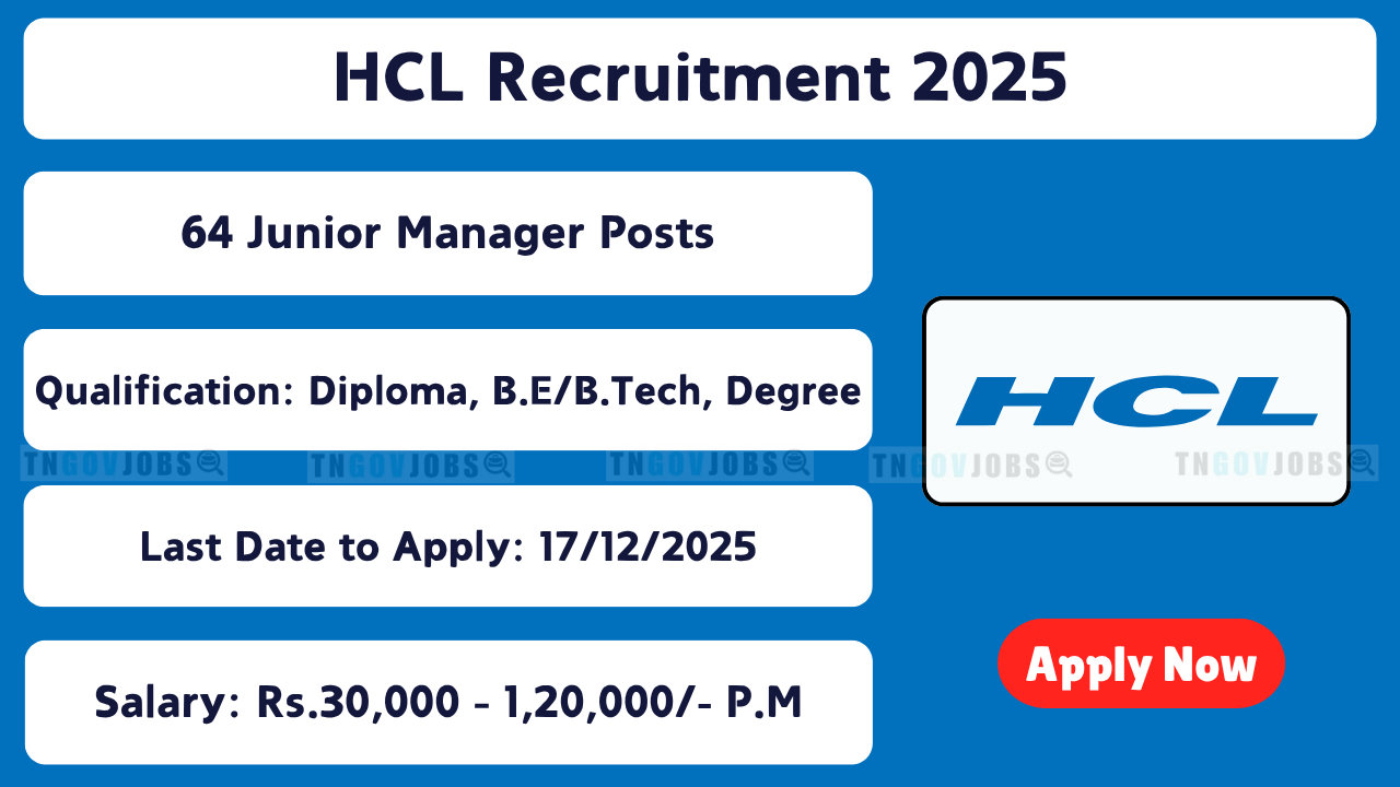 HCL Recruitment 2025: Hindustan Copper Limited (HCL) has released Notification No: 1/2029/2025-26 to fill 64 Junior Manager (E0 Grade) posts. Online applications will be accepted on the official portal hindustancopper.com from 27-11-2025 to 17-12-2025. Before applying, candidates must carefully read the HCL Junior Manager 2025 notification and verify their eligibility.