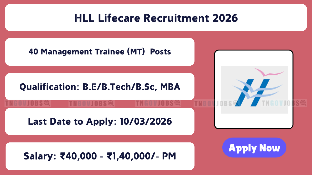 HLL Lifecare Limited Recruitment Notification No: HLL/HR/020/2026 is released! Apply online for 40 Management Trainee (MT) vacancies across Engineering, Pharma, Marketing, HR, Social Work, Data Analytics & Hospital Management. Online registration from 18 February 2026 to 10 March 2026 at lifecarehll.com. Qualification: B.E/B.Tech / B.Pharm / MBA / PGDBM / MSW (post-wise) with 65% marks. Age: Maximum 27 years (relaxations apply). Pay Scale: ₹40,000 – ₹1,40,000. Selection through CBT + Preliminary Interview + Psychometric Assessment + Final Interview. Application fee ₹1,000 / Nil (reserved). Full eligibility & apply process below.