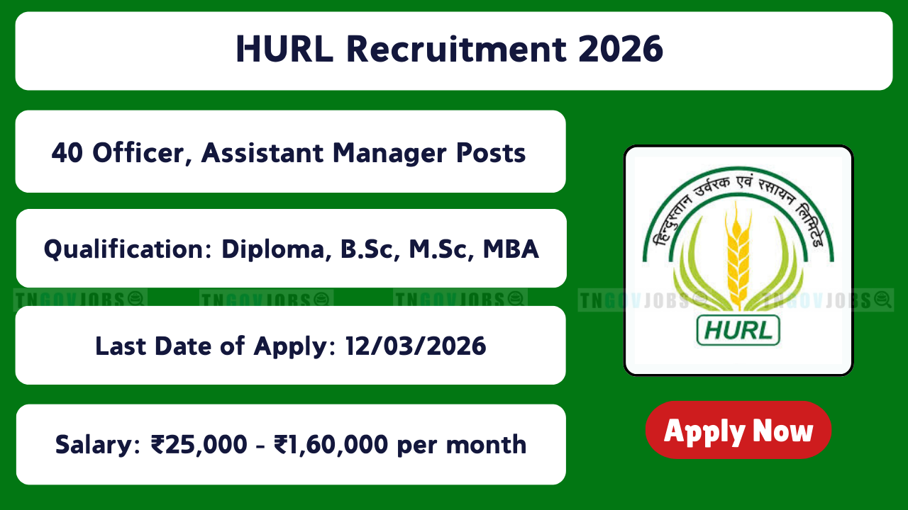 Hindustan Urvarak & Rasayan Limited (HURL) Recruitment Notification No: E/02/2026 is released! Apply online for 40 vacancies – Officer (6), Assistant Manager (3), Officer (Marketing) (1), Junior Engineer Assistant (II) Grade II (Chemical O&U-5, Urea Plant Handling-6, Quality Assurance Mechanical-8, Instrumentation-11). Online registration from 11 February 2026 to 12 March 2026 at jobse0226.hurl.net.in. Qualification: B.Sc (Agri)/B.Tech + MBA (Marketing), Diploma/B.Sc (various trades) + experience (post-wise). Age: 30–35 years (relaxations apply). Pay: ₹25,000 – ₹1,60,000. Selection through Shortlisting + Trade/Skill/Written Test. Full eligibility & apply process below.