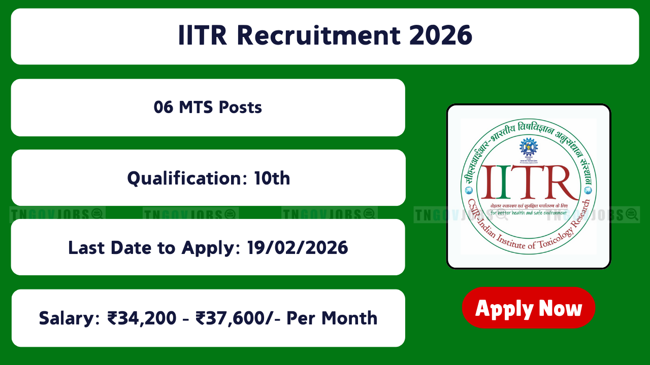 CSIR-IITR Lucknow Recruitment 2026 Notification No: IITR/1/2026 is released! Apply online for 06 regular vacancies – Multi Tasking Staff (MTS – 03 posts) & Driver (03 posts). Online facility from 20 January 2026 (10:00 AM) to 19 February 2026 (05:00 PM). Age limit 25–27 years (relaxations apply). Pay ₹34,200 – ₹37,600 per month. Application fee ₹500 (exempted for reserved). Full eligibility, age, salary & apply process below.