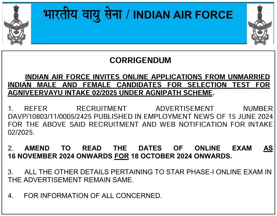 Indian Air Force (IAF) Agniveervayu Intake 02/2025 Exam Date Notice Notice Click Here