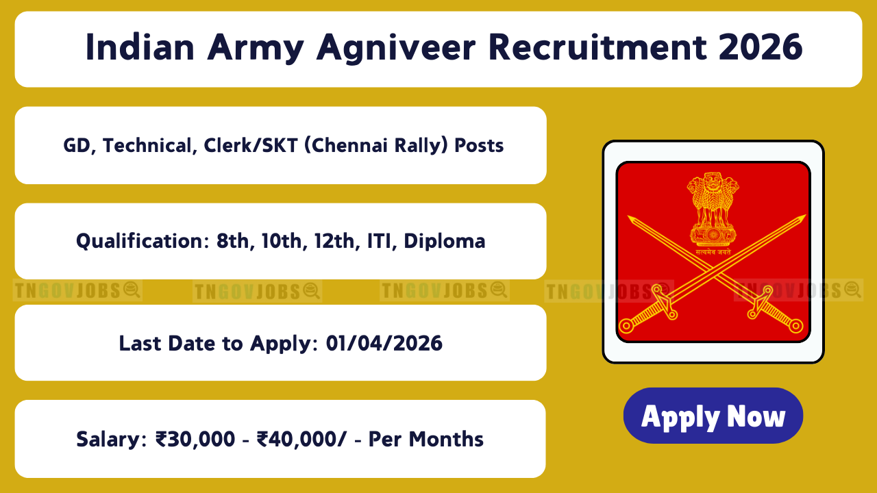 Indian Army Agniveer Recruitment 2026 invites online applications from domiciles of 11 Tamil Nadu districts (Vellore, Tirupattur, Ranipet, Villupuram, Kallakurichi, Chennai, Cuddalore, Tiruvannamalai, Tiruvallur, Kancheepuram, Chengalpattu Of State Of Tamilnadu And Puducherry District Of Union Territory Of Puducherry) for Agniveer (General Duty), Agniveer (Technical), Agniveer (Clerk / Store Keeper Technical), Agniveer Tradesmen (All Arms) under Agnipath Scheme (4-year temporary service). Online registration from 13 February 2026 to 01 April 2026 at joinindianarmy.nic.in. Full eligibility & apply process below.