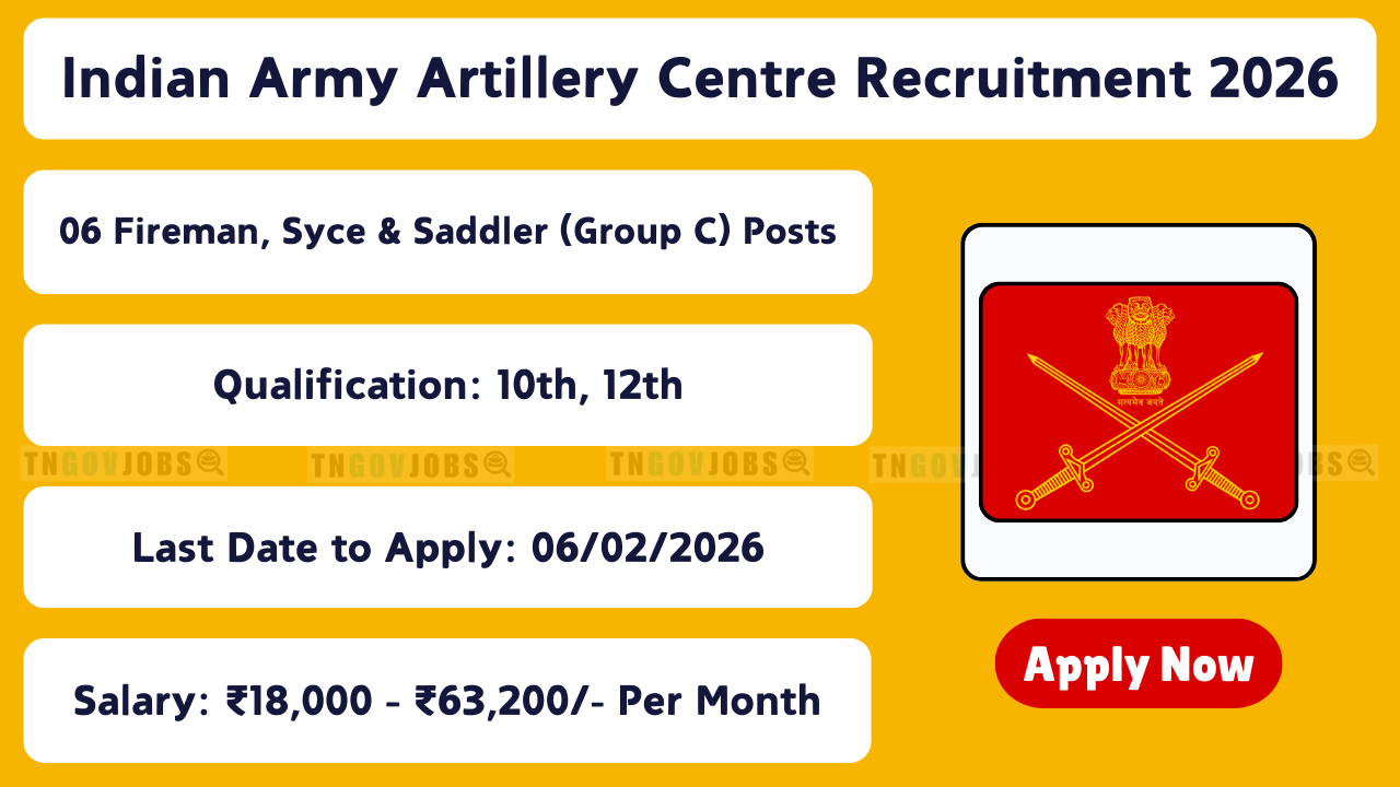 Indian Army Artillery Centre Recruitment 2026: Headquarters, School of Artillery, Devlali (Nasik) invites applications for 06 Fireman, Syce & Saddler (Group C) Posts. Apply Offline before 06-02-2026. No Application Fee!