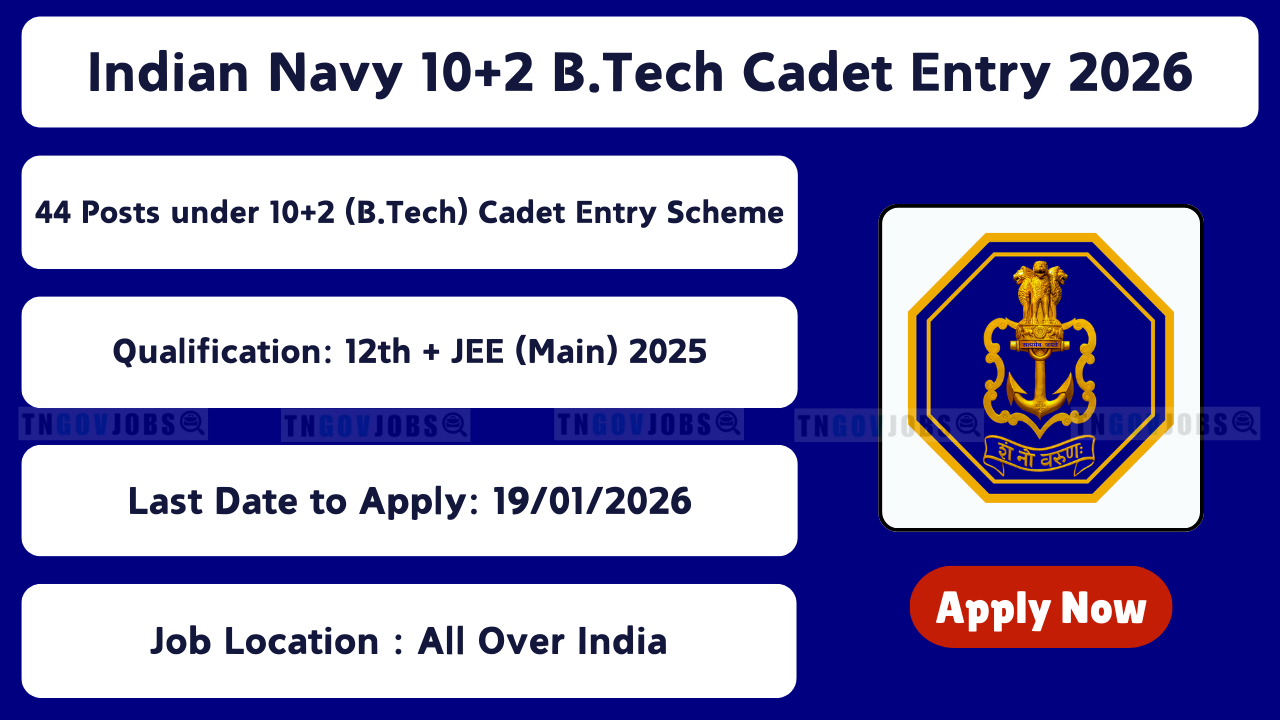 Indian Navy 10+2 B.Tech Cadet Entry 2026: Indian Navy invites applications for 44 Posts under 10+2 (B.Tech) Cadet Entry Scheme (Permanent Commission) July 2026 Batch. Apply Online from 03-01-2026 to 19-01-2026. No Application Fee!