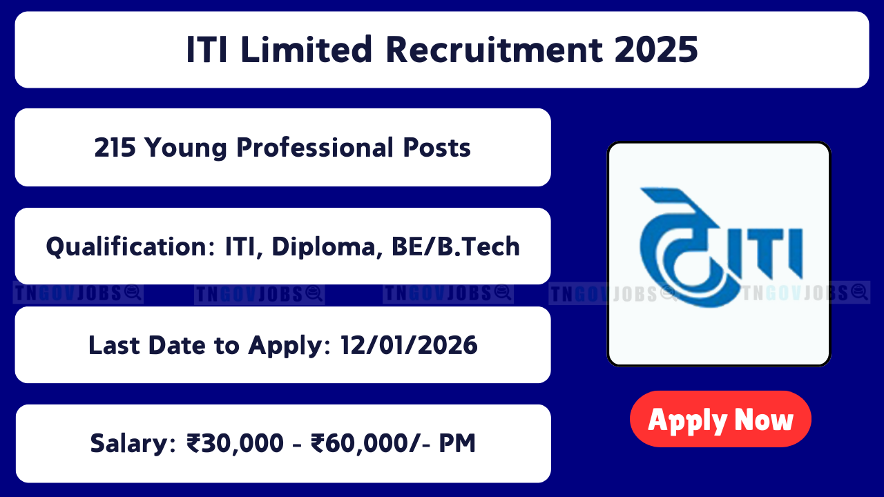 ITI Limited Recruitment 2025: Indian Telephone Industries Limited (ITI Ltd) has released notification for 215 Young Professional Posts (Graduate, Technician, Operator, Generalist, Official Language). Apply Online before 12-01-2026. No Application Fee!