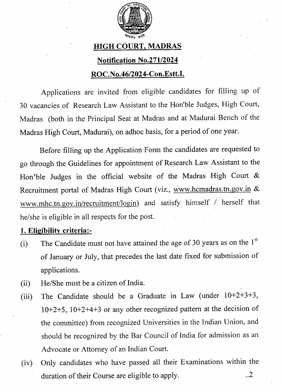 Madras High Court Recruitment 2024 : Madras High Court invites applications from eligible candidates for filling up of 30 vacancies of Research Law Assistant to the Hon’ble Judges, High Court, Madras (both in the Principal Seat at Madras and at Madurai Bench of the Madras High Court, Madurai), on adhoc basis, for a period of one year. Interested candidates can Apply Offline on or Before 22.11.2024.