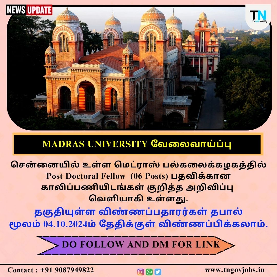 Madras University Recruitment 2024: University of Madras (Madras University) invites Offline Application for Recruitment to the Post of Post Doctoral Fellow in Chennai. Eligible candidates can Apply Offline on or Before 04.10.2024.