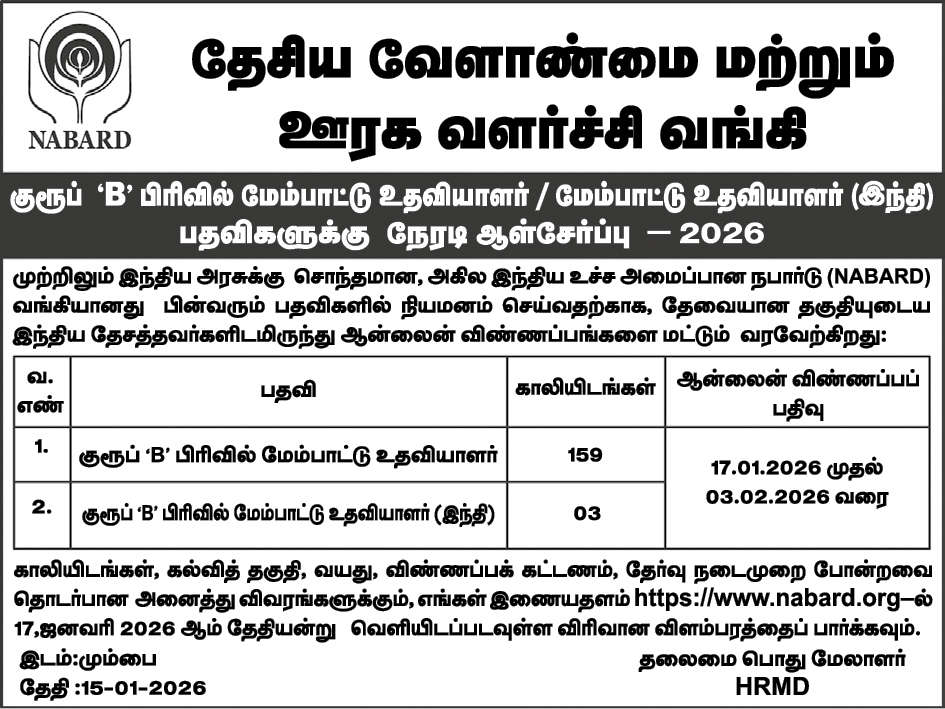Interested and eligible candidates must visit the official NABARD website at www.nabard.org and complete the online application form. The online registration will be available from 17-01-2026 and will close on 03-02-2026. Candidates are advised to carefully fill in all details and submit the application before the last date.