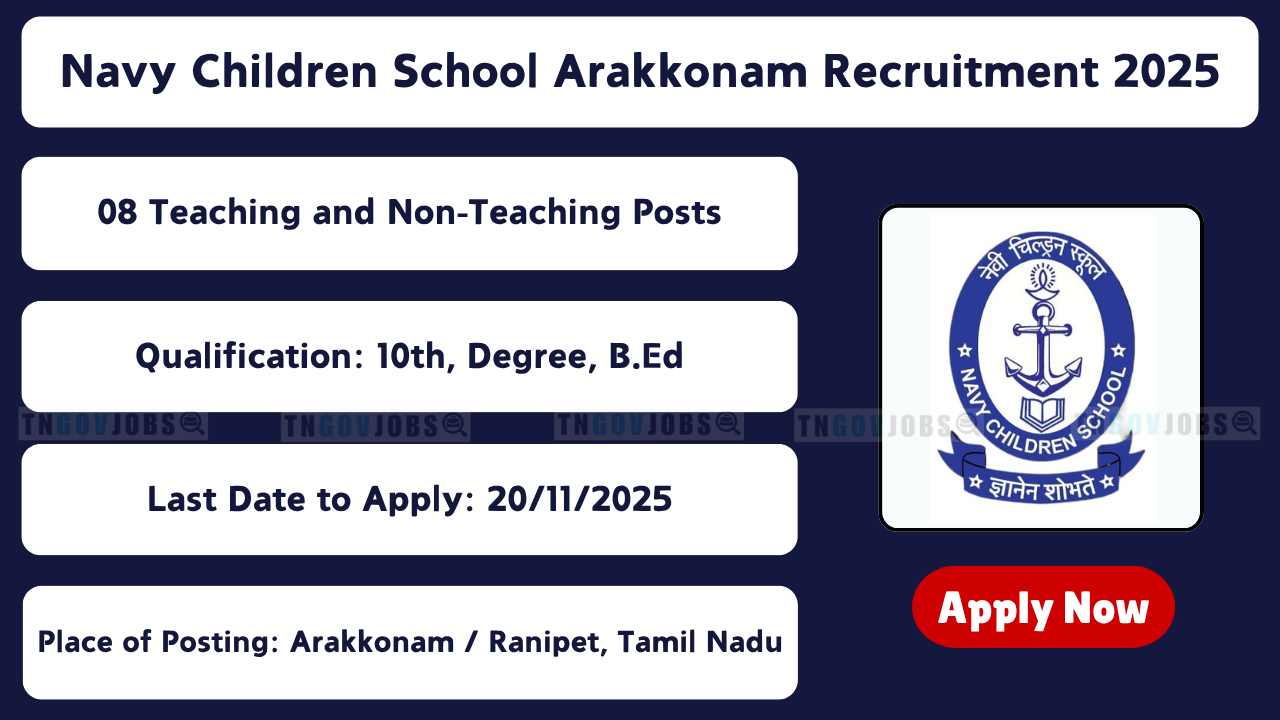 Navy Children School Arakkonam Recruitment 2025: Navy Children School Arakkonam has released a notification to fill 08 Teaching and Non-Teaching Posts including Vice Principal, PGT (Physics/Mathematics), TGT (Social Science), PRT-General, Accountant, and Support Staff (Peon, Ayah, Night Watchman). Download the application form from ncsarakkonam.nesnavy.in and submit the filled form along with enclosures on or before 20-11-2025.