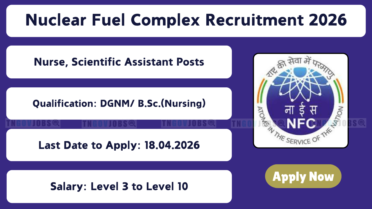 Nuclear Fuel Complex (NFC) Recruitment Notification No: NFC/01/2026 is released! Apply online for 18 vacancies – Scientific Officer (C) GDMO (3), Nurse(A) (11), Scientific Assistant(B) Radiographer (1), Scientific Assistant (B) Pathology Technician (1), Pharmacist (B) (1), Technician(B) X-ray Technician (1). Online registration from 21 March 2026 (10:00 AM) to 18 April 2026 (05:00 PM) at nfc.gov.in. Qualification: MBBS / B.Sc Nursing / DGNM / B.Sc Radiography / DMLT / B.Sc MLT / HSC + Diploma in Pharmacy / X-ray Technique. Age: 18–25/30/35 years (relaxations apply). Pay: Level 3 to Level 10. Selection through Preliminary Test + Advanced Test + Skill Test. Application fee ₹500 / ₹150 / ₹100 (post-wise). Full eligibility & apply process below.