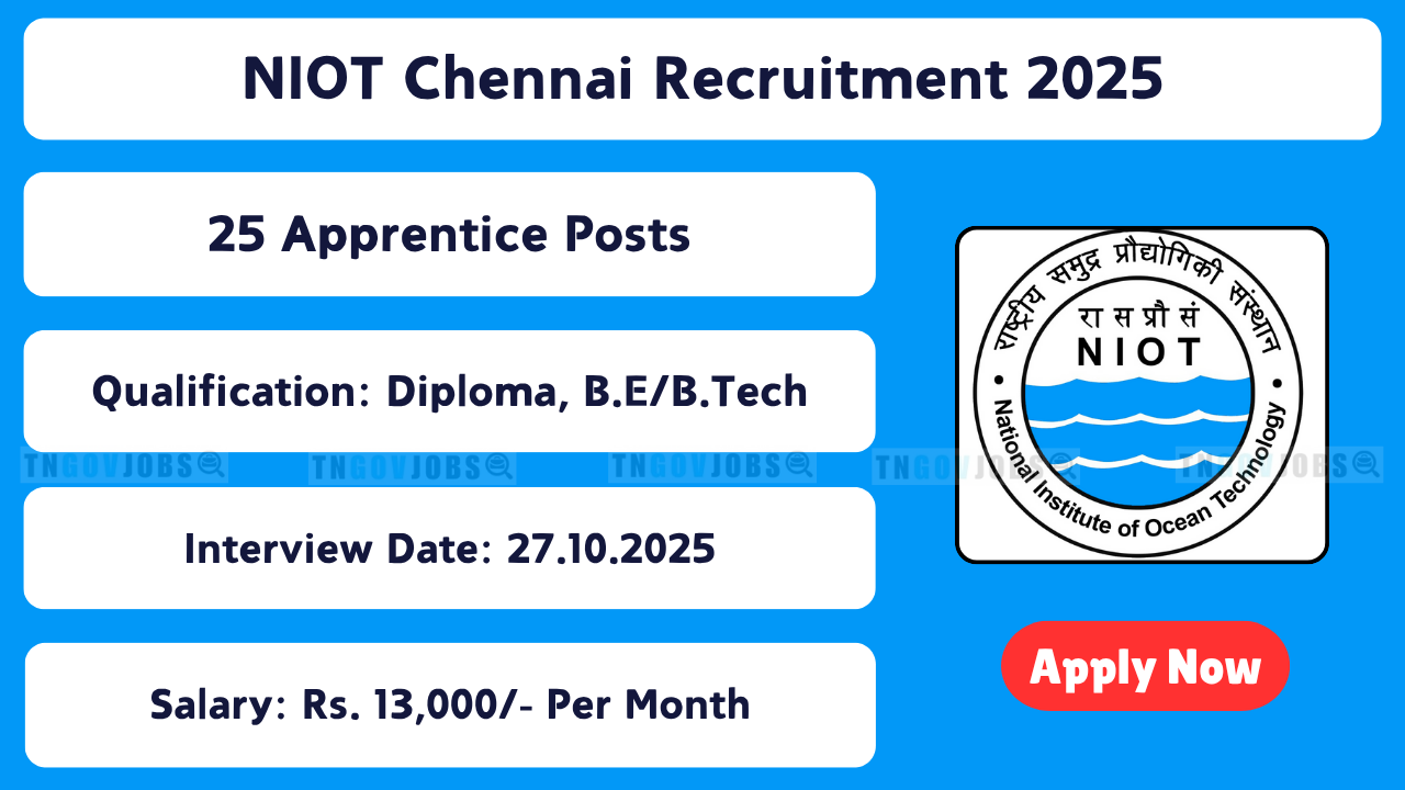 NIOT Chennai Apprentice Recruitment 2025: National Institute of Ocean Technology (NIOT), Chennai has released Notification No. NIOT/E&P/06/2025 (Apprenticeship) to fill 25 posts of Technician (Diploma) and Graduate (Degree) Apprentices. Candidates must register online at the NATS portal and attend the walk-in interview on 27-10-2025. The application form can be downloaded from https://www.niot.res.in/. Candidates must verify their eligibility as per the notification and bring original documents to the interview. Applicants should maintain a working Email Address and Mobile Number until the recruitment results are announced.