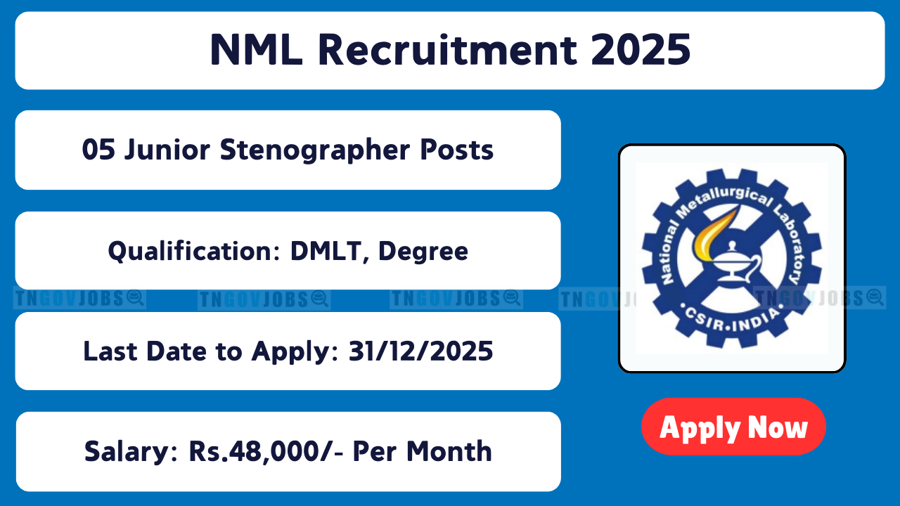 NML Recruitment 2025: National Metallurgical Laboratory (NML) has released the recruitment notification No: 07/2025 to fill the 05 Junior Stenographer Posts. This online facility will be available on the Official website @ https://www.nml.res.in/ from 01-12-2025 at 11:00 AM to 31-12-2025 at 11:00 PM. Before submitting an application, candidates must carefully read the NML Junior Stenographer 2025 notification and verify their eligibility. Check the NML Notification 2025 for salary and additional benefits like medical insurance, PF, TA/DA, etc. Applicants must have a working Email Address and Mobile Number that they maintain until the NML Recruitment 2025 results are announced.