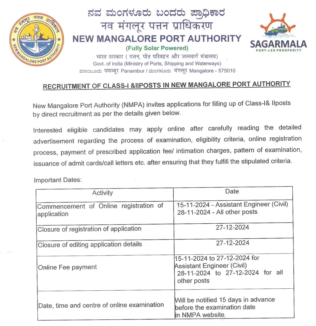 NMPA Recruitment 2024: New Mangalore port Authority (NMPA) invites applications for filling up the AE, AO, AAO, Sports Officer, Assistant Secretary, Deputy Director, Assistant Traffic Manager, Senior Medical Officer, Deputy Director, Law Officer & Assistant Director Posts. Interested candidates can Apply Online on or before 27.12.2024.