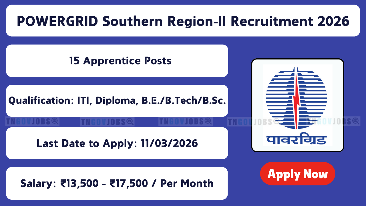 POWERGRID Southern Region-II Recruitment Notification No: Apprenticeship/2025-26/SR-II/02 is released! Apply online for 15 Apprentice vacancies under NAPS/NATS. Online registration from 02 March 2026 (10:00 AM) to 11 March 2026 at powergrid.in (after NAPS/NATS registration). Qualification: ITI Electrician / 3-year Diploma Electrical / 4-year B.E/B.Tech Civil (passed within last 2 years). Stipend: ₹13,500 – ₹17,500 per month. Selection through Merit List + Certificate Verification. Full eligibility & apply process below.