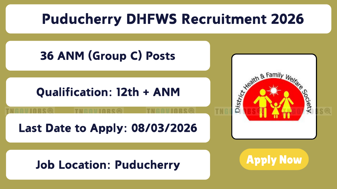 Directorate of Health and Family Welfare Services (DHFWS), Puducherry Recruitment Notification No: 12020/1/E1/2026/DHFWS is released! Apply online for 36 ANM (Group C Non-Gazetted Non-Ministerial) vacancies. Online registration from 28 February 2026 (10:00 AM) to 08 March 2026 (03:00 PM) at recruitment.py.gov.in. Hard copy submission last date: 11 March 2026 (05:00 PM). Qualification: 12th pass + Diploma in Multipurpose Health Worker (Female) / Auxiliary Nurse Midwife OR equivalent + registration as Midwife + studied Tamil/Telugu/Malayalam in SSLC or above. Nativity/Residence: Puducherry native & 5 years continuous residence. Age: 18–30 years (relaxations apply). Pay: Level 4. Selection through Shortlisting + Certificate Verification. Full eligibility & apply process below.
