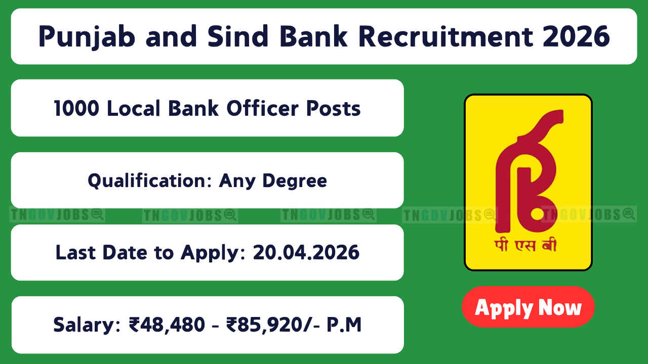 Punjab and Sind Bank has released the official notification for the lateral recruitment of **1000 Local Bank Officers (LBO) in Junior Management Grade Scale I (JMGS I)** across 17 states. This is a regular basis banking job requiring graduation + minimum 18 months post-qualification branch experience as an officer in a Scheduled Commercial Bank or Regional Rural Bank. Online applications are open from **31 March 2026 to 20 April 2026**. Tamil Nadu has **65 vacancies** with Tamil as mandatory local language proficiency.