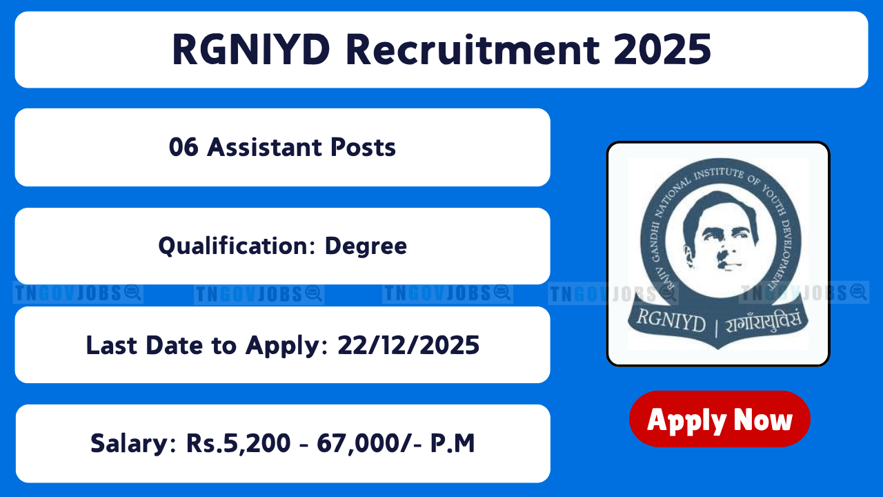 RGNIYD Recruitment 2025: Rajiv Gandhi National Institute of Youth Development (RGNIYD) has released the recruitment notification No: RGNIYD/Rec/Regular & Contract NT/2025-26/005 to fill 06 Teaching & Non-Teaching Posts . This is a golden opportunity for both freshers and retired government officials. Apply offline before 22-12-2025 .