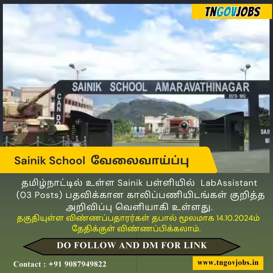 Sainik School Amaravathinagar Recruitment 2024: Sainik School Amaravathinagar invites Offline application for recruitment to the Post of PGT- Physics, Laboratory Assistant (Physics), Nursing Sister (Female) Posts in Amaravathinagar (Tamil Nadu). Eligible candidates can Apply Offline on or before 14.10.2024.