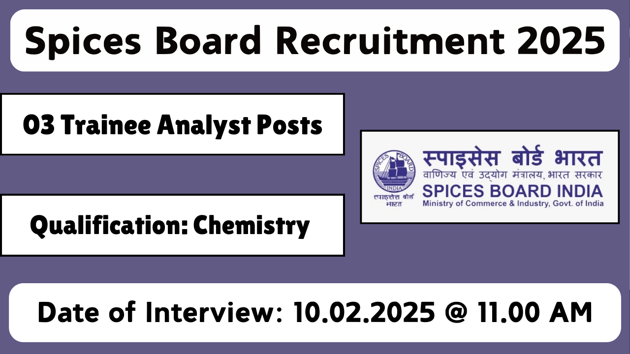 Spices Board Recruitment 2025: Spices Board has issued Recruitment Notification No: 01/2025 for the recruitment of 03 Trainee Analyst – Chemistry posts. Applicants must download the application form in PDF format from the official website indianspices.com.