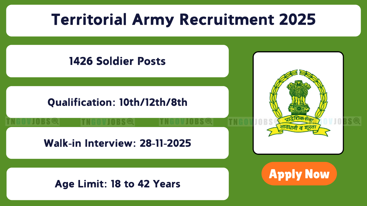 Territorial Army Recruitment 2025: Territorial Army has released a notification at jointerritorialarmy.gov.in for recruitment to the posts of Soldier in multiple states including Tamil Nadu. Interested candidates can attend the walk-in-interview on 01-12-2025 at the specified venues. Candidates must carefully review the Territorial Army notification details, including eligibility, selection process, and application procedure.