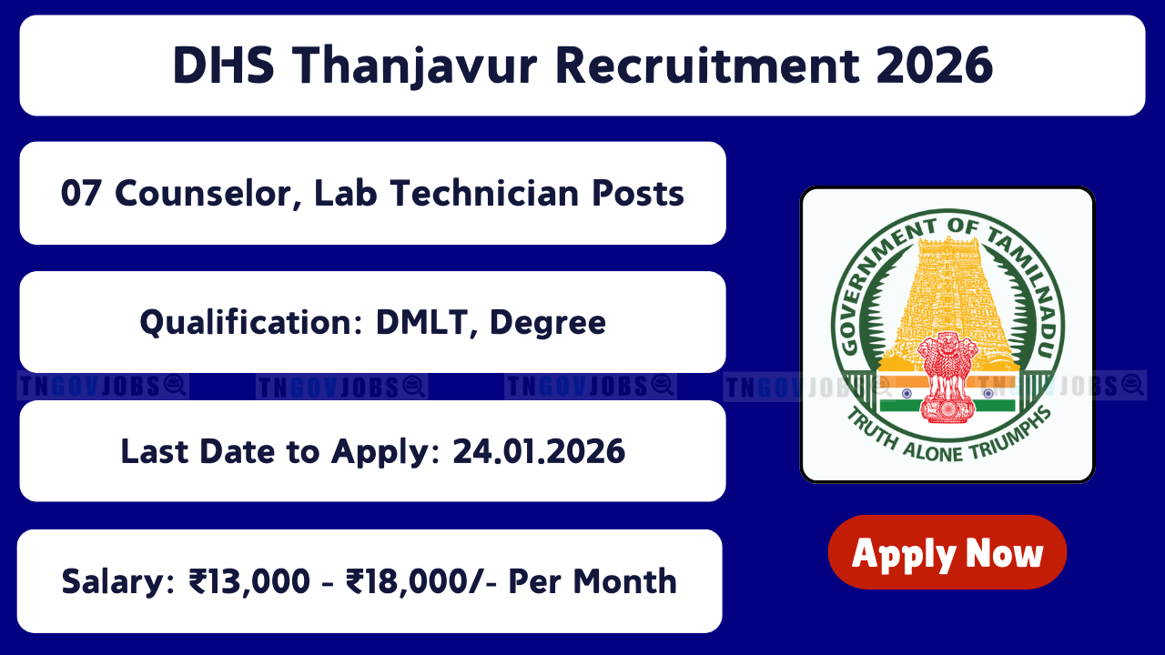 Thanjavur DHS Recruitment 2026: Thanjavur District Health Society has released notification for 07 Counselor & Lab Technician Posts. Apply Offline before 24-01-2026. No Application Fee!