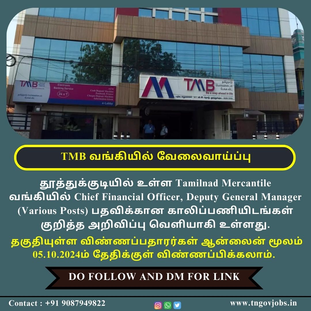 TMB Bank Recruitment 2024: Tamilnad Mercantile Bank (TMB) invites Online Application for Recruitment to the Post of Chief Financial Officer, Deputy General Manager in Thoothukudi. Eligible candidates can Apply Online on or Before 05.10.2024.