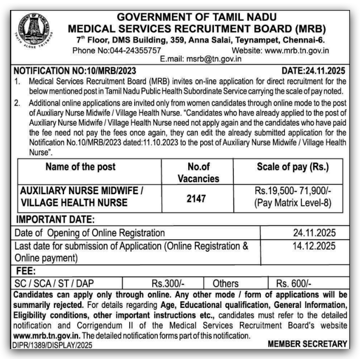 Tamilnadu MRB Recruitment 2025: Medical Services Recruitment Board (MRB), Tamilnadu has released the recruitment notification No: 10/MRB/2023 dated 24.11.2025 to fill 2147 Auxiliary Nurse Midwife / Village Health Nurse posts. This online facility will be available on the official website mrb.tn.gov.in from 24.11.2025 to 14.12.2025. Before submitting an application, candidates must carefully read the Tamilnadu MRB ANM/VHN 2025 notification and verify their eligibility. Check the MRB Notification 2025 for salary and additional benefits like medical insurance, PF, TA/DA, etc.