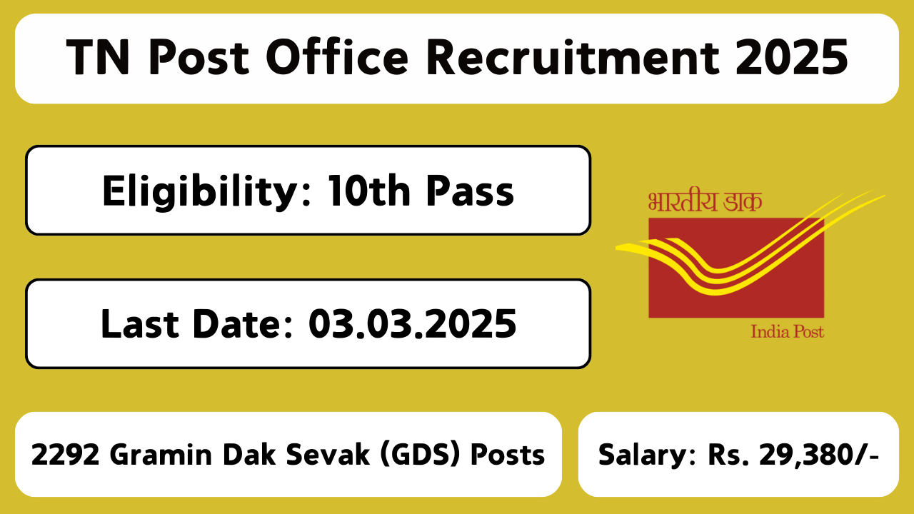 TN Post Office Recruitment 2025: Tamilnadu Post Office has announced recruitment notification No: 17-02/2025-GDS to fill 2292 Gramin Dak Sevak (GDS) posts. The online application process will be available on the official website indiapostgdsonline.gov.in from 10.02.2025 to 03.03.2025. Interested candidates should check the notification and apply within the given dates.