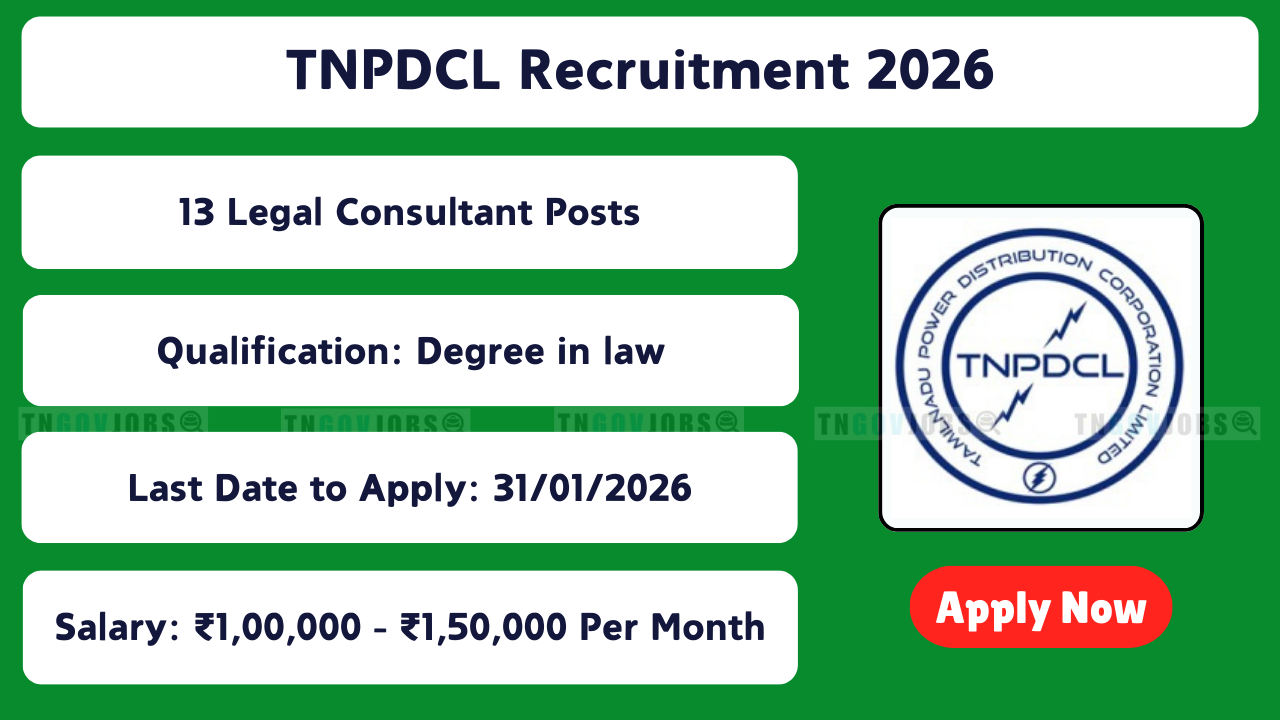 Tamil Nadu Power Distribution Corporation Limited (TNPDCL) Recruitment 2026 Notification is released! Apply offline for 13 Legal Consultant vacancies – Senior Legal Consultant (10 posts) & Legal Consultant (3 posts) on contract basis. Last date to receive applications: 31 January 2026. Salary ₹1,00,000 – ₹1,50,000 per month. Age limit up to 65 years. Qualification: Law Degree + Bar Council enrollment + continuous practice in Constitutional Courts / Statutory Tribunals. Preference for Engineering graduates (Electrical/Mechanical). Full eligibility, age, salary & apply process below.