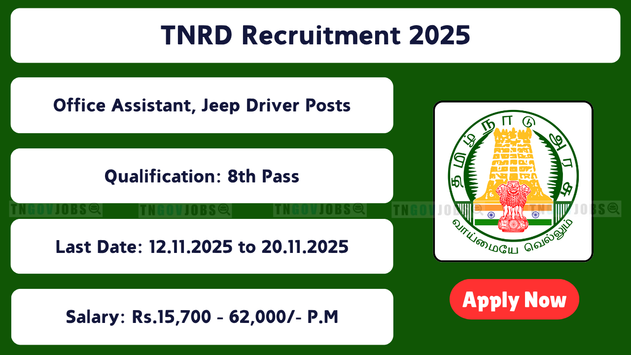 SEO: TNRD Recruitment 2025, Tamil Nadu Rural Development Jobs 2025, TNRD Office Assistant, Jeep Driver & Night Watchman Vacancies — check latest official notifications and district-wise apply links at tn.gov.in .