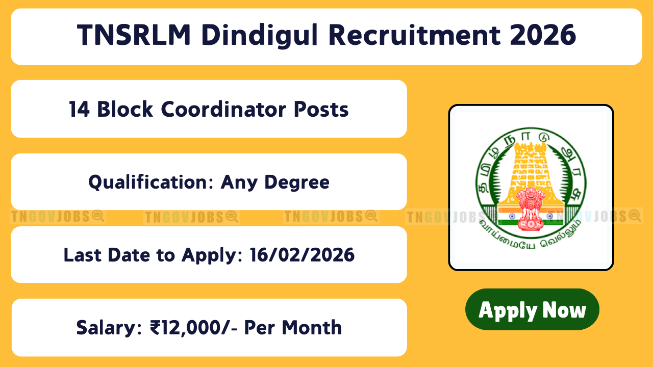 Tamil Nadu State Rural Livelihood Mission (TNSRLM Dindigul) Recruitment 2026 is released! Submit offline applications for 14 Block Coordinator vacancies across various blocks in Dindigul District. Last date for receipt of filled applications: 16 February 2026. Qualification: Any Degree + minimum 3 months MS-Office certificate OR B.Sc (Computer Science) OR BCA. Age: 18–30 years (as on 16-02-2026). Pay: ₹12,000 per month. Selection through Interview. No application fee. Candidates must belong to the respective block. Full eligibility & apply process below.