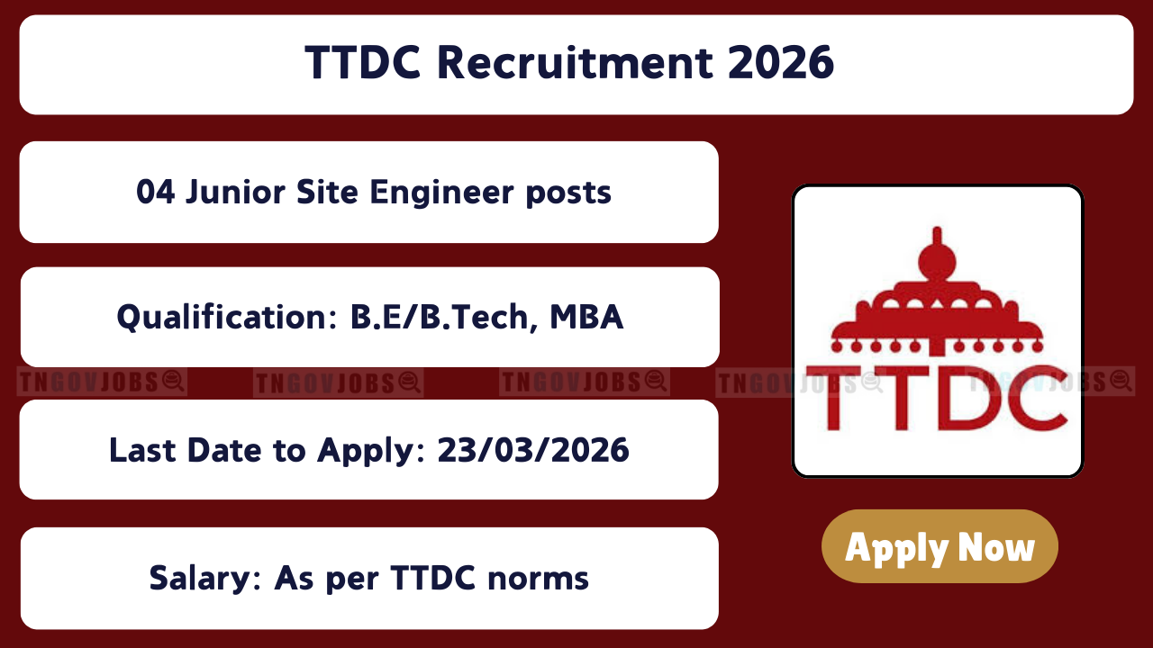 TTDC Recruitment 2026: Tamil Nadu Tourism Development Corporation Limited (TTDC) has released its latest official recruitment notification (Advt. No. 0999/A1/2024 Dated:25.02.2026) to fill 04 Junior Architect, Site Engineer (Civil), AGM (Marketing) posts. The online application portal at the official website ttdconline.com will remain active from 11-03-2026 to 23-03-2026. Candidates should carefully read the official notification before applying.