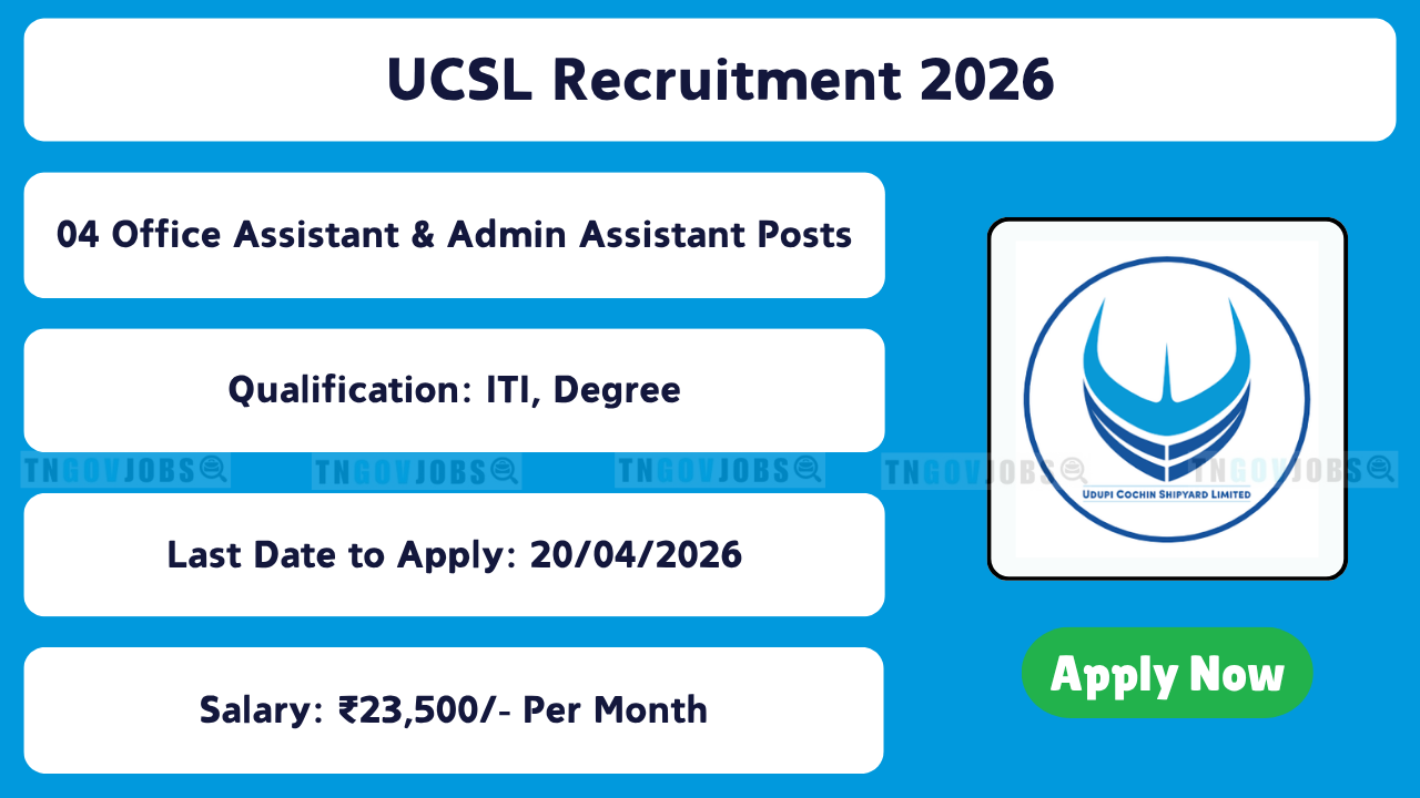 Udupi Cochin Shipyard Limited (UCSL) has released a notification for recruitment of **4 posts** – Office Assistant and Admin Assistant on contract basis at Udupi (Malpe), Karnataka. Interested and eligible candidates can apply online through the official website on or before 20 April 2026.
